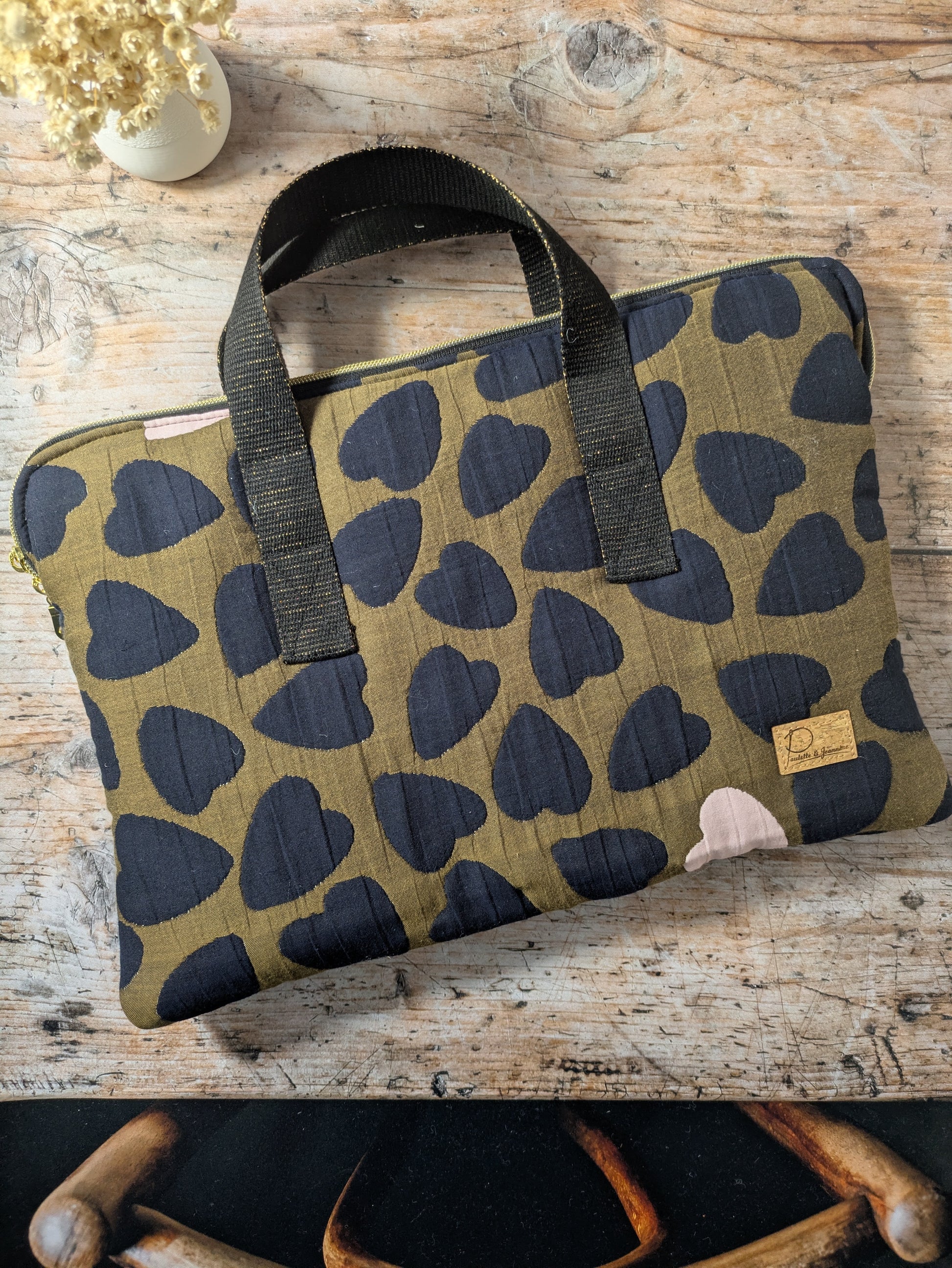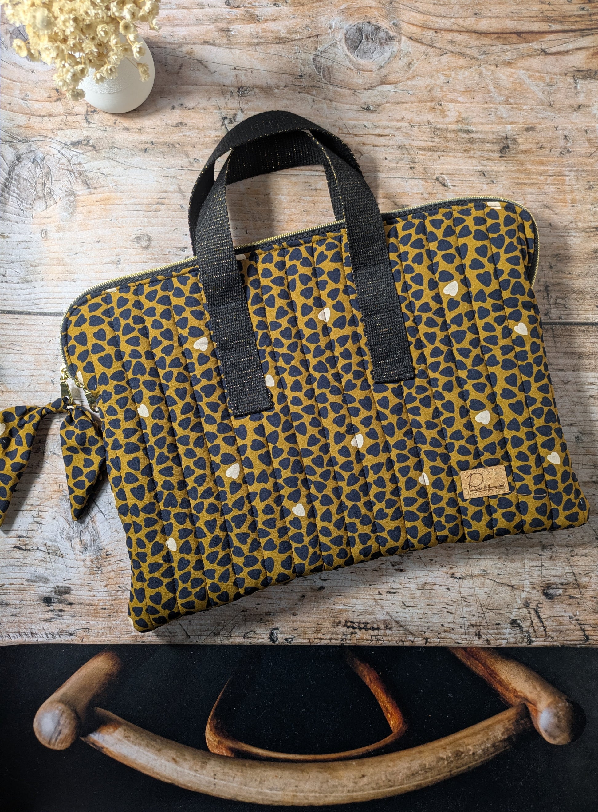 Pochette pour ordinateur 15p avec un tissu de créateurs ou liberty matelassé. La pochette se ferme par une fermeture éclair à 2 curseur, et transportable avec ses deux anses